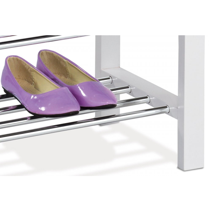 Dřevěný botník namořený do bílé barvy se sedákem v šedé kožence.