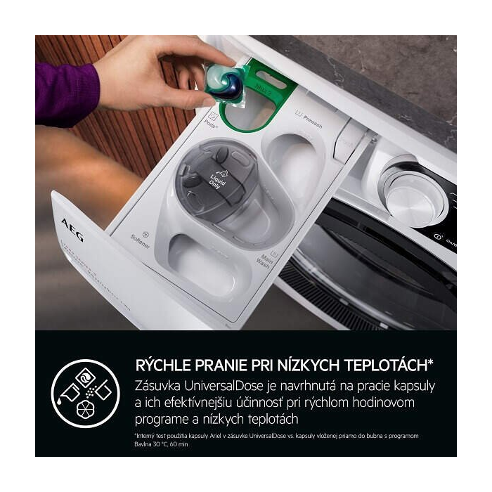 UniversalDose je jedinečná zásuvka navrhnutá na použitie pracích kapsúl PODS®. Kapsule sa v UniversalDose rozpustia vďaka inovatívnemu systému vodných trysiek o 60 % rýchlejšie než pri vložení do bubna. V priebehu hodinového programu tak UniversalDose prináša extra výkon a odstráni škvrny aj pri nízkych teplotách.