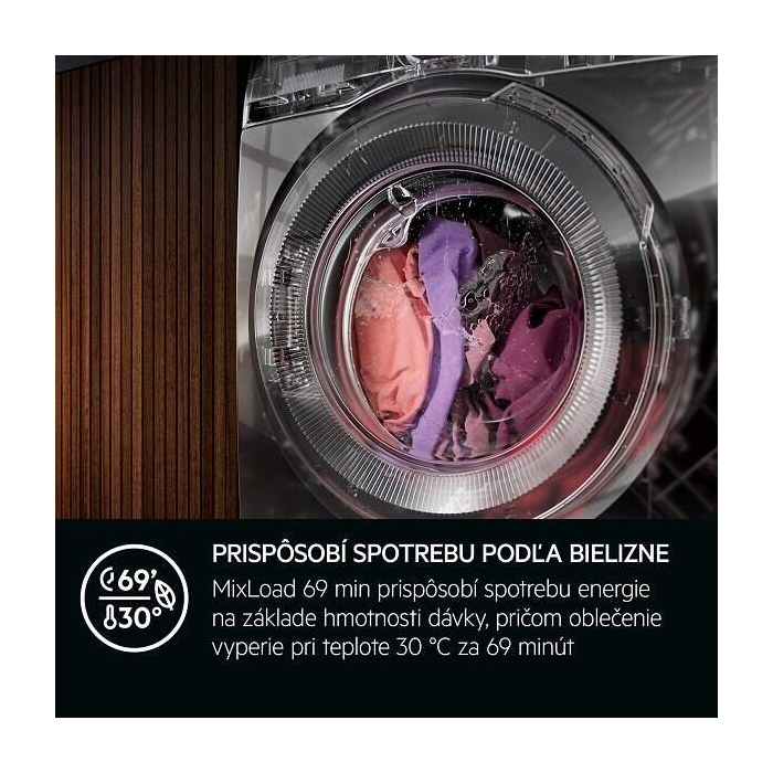 Pracie programy: MixLoad 69min, Eco 40-60, bavlna, syntetika, jemná bielizeň, vlna, 20min 3Kg, para, športová bielizeň, Hygiene, plákanie, odstredenie/vypustenie