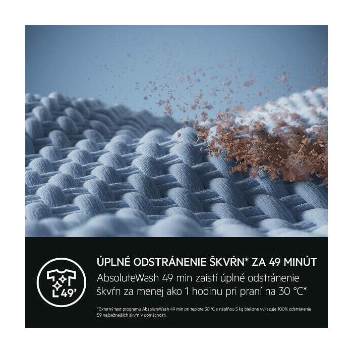 Výkonný program AbsoluteWash 49 min dôkladne vyčistí oblečenie už pri 30 °C za menej než 1 hodinu. Filtráciou vody zvýšuje účinnosť pracieho prostriedku a odstraňuje škvrny. Pri čistení oblečenia spotrebuje o 30 % menej energie.