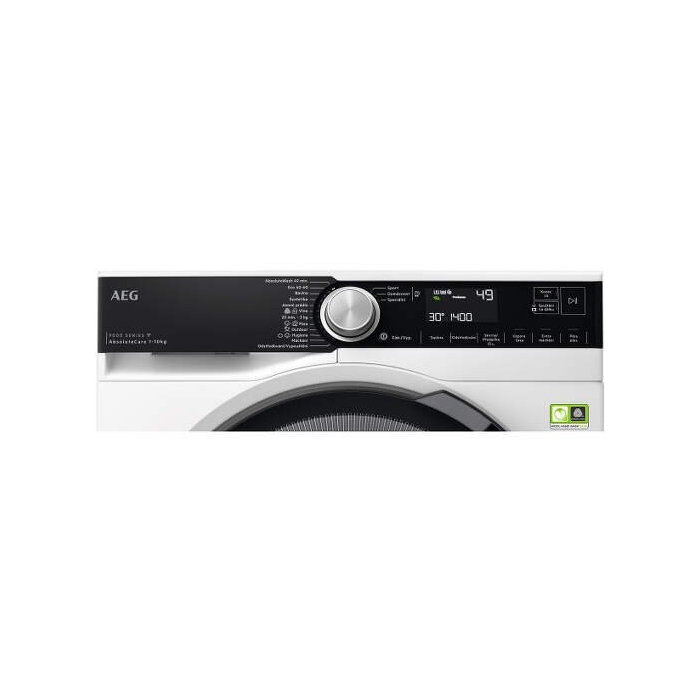 Inteligentná spredu plnená práčka AEG 9000 AbsoluteCare® LFR95146UC v bielej farbe s čierným ovládacím panelom a čiernými dvierkami. Na jeden cyklus vyperie 10 kg prádla pri maximálnych otáčkach 1400 ot./min. K dispozícií má 12 programov a praktické funkcie. Disponuje AbsoluteCare, AbsoluteWash, aplikáciou My AEG Care, PowerCare, SteamRefresh.