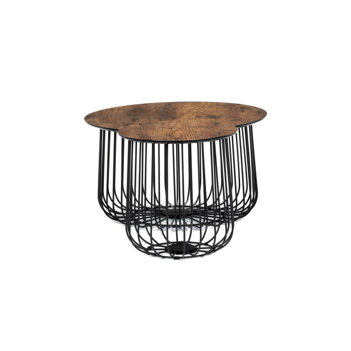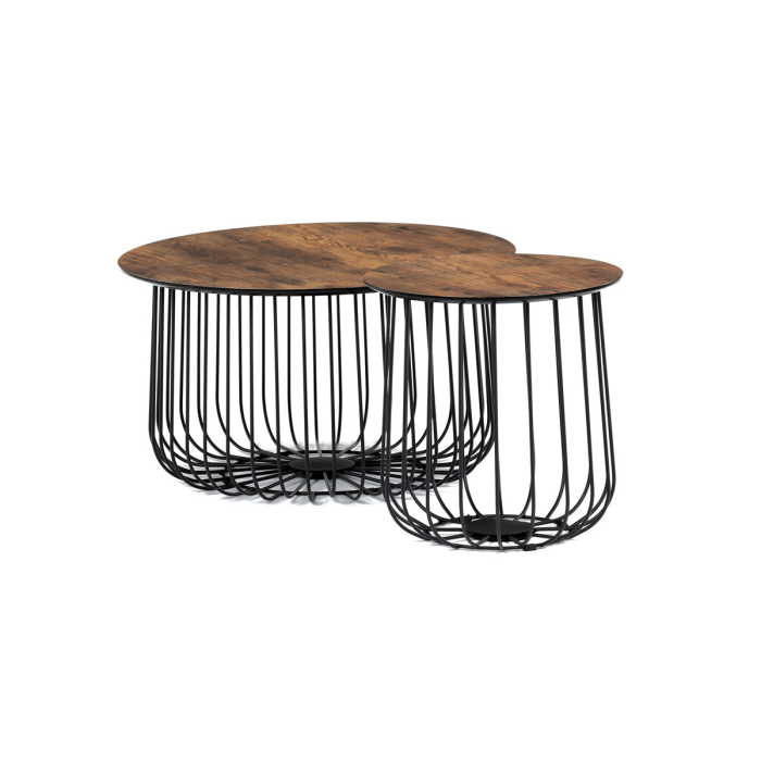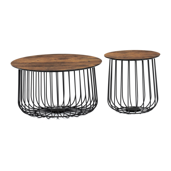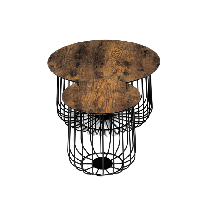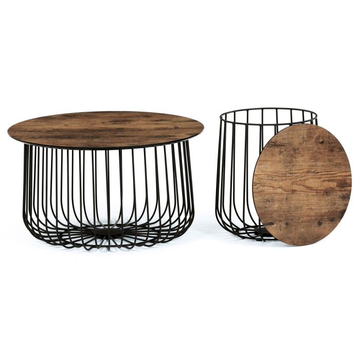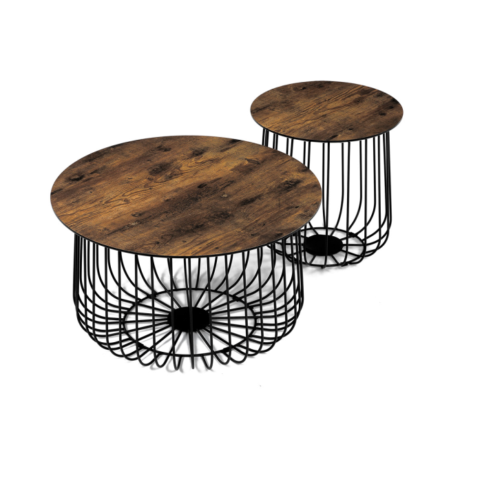 Set 2 ks variabilních a multifunkčních stolků, které můžete využít nejen jako konferenční set, ale skvěle poslouží i jednotlivě jako odkládací nebo přístavné. A to není vše. Po odklopení desky může stolek sloužit jako úložiště nebo odkladiště jistě potřebných věcí v domácnosti, které musíte mít stále při ruce anebo jen jako pokorný dekorativní prvek v interiéru, na který postavíte třeba jen květinu. Variabilita je opravdu neomezená a stačí zapojit fantazii. Co třeba dát dovnitř stolků vlastní květinové aranže či jinak vydekorovat anebo umístit příhodnou živou květinu. Pak už se stačí jen kochat vlastní tvorbou a se zalíbením sledovat závistivé pohledy návštěv. Stolky jsou v lehkém minimalistickém designu ve velmi oblíbeném industriálním stylu. Desky jsou z MDF tl. 18 mm, ze spodní části v černém matu se sraženou obvodovou hranou a v horní pohledové v 3D dekoru staré dřevo. Drátěná kovová konstrukce ze subtilních kulatých profilů je v černém matu, povrchová úprava je kvalitním práškovým vypalovacím lakem. Ve spodní části jsou gumové patky, které zamezují poškození povrchu tvrdých podlah a zároveň zabraňují i nechtěnému posunu stolků. Větší stolek má průměr desky 60 cm a výšku 34 cm, vyšší má průměr 37 cm a výšku 39 cm. Nosnost stolků je do 30 kg každý. Stolky jsou velmi nenáročné na údržbu, stačí je otřít vlhkým hadříkem s vhodným čistícím prostředkem a už jen vysušit. Tento klad jistě ocení každý, a to nejen při úklidu. A dalším skvělé plus je, že zcela odpadá složitá montáž. Jen opatrně vybalíte, nasadíte desky a stolky jsou připraveny Vám sloužit dlouhá léta a vnést do Vašeho interiéru šarm industriálního stylu.