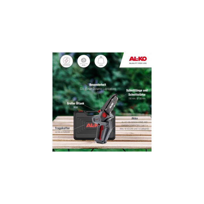 Jedinečné mazanie SDL® (Smart Dynamic Lubrication) na pohodlné mazanie reťaze podľa potreby. Dĺžka lišty 15 cm pri rýchlosti reťaze 7 m/s. Rýchla kontrola hladiny oleja cez kontrolné okienko na olejovej nádrži. Výkonný rezný výkon až do 130 mm. Veľká 30 ml nádrž na olej. 18 V systém BOSCH HOME AND GARDEN COMPATIBLE (batéria a nabíjačka sú súčasťou dodávky). Dodáva sa s kufríkom a 30 ml bio reťazového oleja.