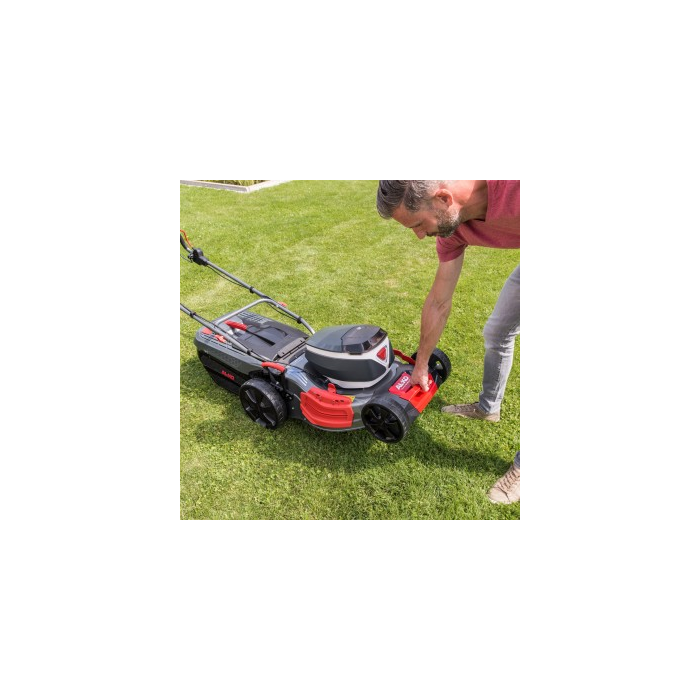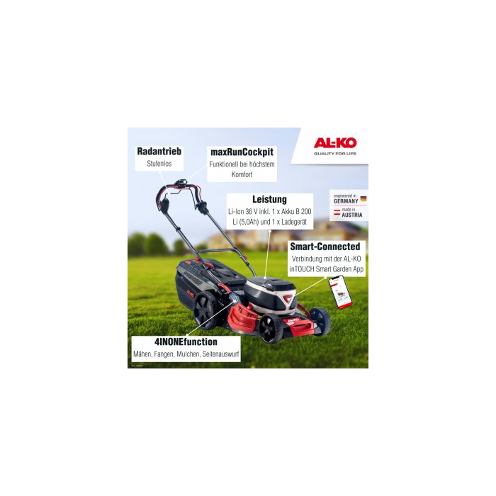 S funkciou Smart Cockpit a Smart Button. Priestor na betériu až pre dve batérie s vyvázeným vybíjaním pre maximálnu dobu prevádzky. Výkonná lítium-iónová batéria 36 V / 4Ah. Energeticky úsporný pohon kolies s variabilnou rýchlosťou. Pohodlné 7-polohové centrálne nastavenie výšky kosenia. Odolný kryt z oceľového plechu pre dlhú životnosť. Optimálny výkon kosenia a zberu vďaka aerodynamickému dizajnu krytu.