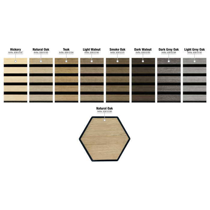 Dizajnový interiérový akustický nástenný panel na zníženie hluku a zlepšenie akustiky v domácnostiach aj kanceláriách. Atraktívny design, jednoduchá montáž, dekor hikora.