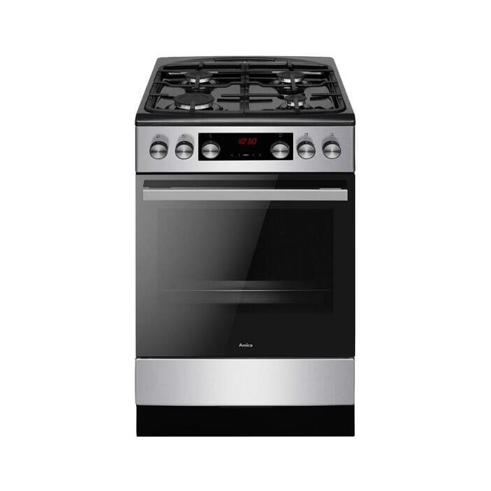 Kombinovaný sporák Amica SPS 111 STX v čierno-nerezovej farbe ponúka plynovú varnú dosku a multifunkčnú elektrickú rúru. Varná zóna má k dispozíci malý horák, 2x stredný, veľký horák a liatinové rošty. Rúra s objemom 65 l je vybavená 11 funkciami pečenia, Super rýchlym ohrevom, elektronickým zapaľovaním, teleskopickými výsuvmi, Soft Close a výsuvným odkladacím priestorom. Všetky práce súvisiace s pripojením na prívod plynu musí vykonať kvalifikovaná osoba. Plynová hadica nie je súčasťou balenia.