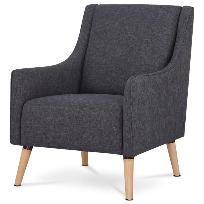 Elegantní křeslo lehkém nádechu skandinávského stylu. Designovou kombinací rovných tvarů v kontrastu s oblými tvary působí stroze, ale velmi zajímavě. Křeslo je celočalouněné, lze ho použít ke klasickému přisazení ke stěně anebo umístit ve středu místnosti. V obou případech bude nepřehlédnutelný solitér. Uplatnění najde jak v obývacím pokoji, hale, ale i ložnici nebo v konferenčních místnostech. Potah je z jemně hrubé látky v nadčasově černé barvě, kostra z masivního borovicového dřeva a překližky. Výplň je z kvalitní PU pěny. Kónické nohy jsou vyrobeny z masivního březového dřeva v přírodním odstínu a lakované transparentním lakem. Riziko poškození podlahových krytin je zde eliminováno plastovými kluzáky na dotykové ploše nohou. Světlá výška křesla je 20 cm, výška područek je 59 cm. Nosnost křesla výborných 120 kg. Kvalita, barevné provedení a dokonalost provedení ocení každý jeho vlastník, ale velmi potěší i příležitostné návštěvy. Pohodlí a vnitřní prostornost nedovolí toto křeslo bez otálení opustit.