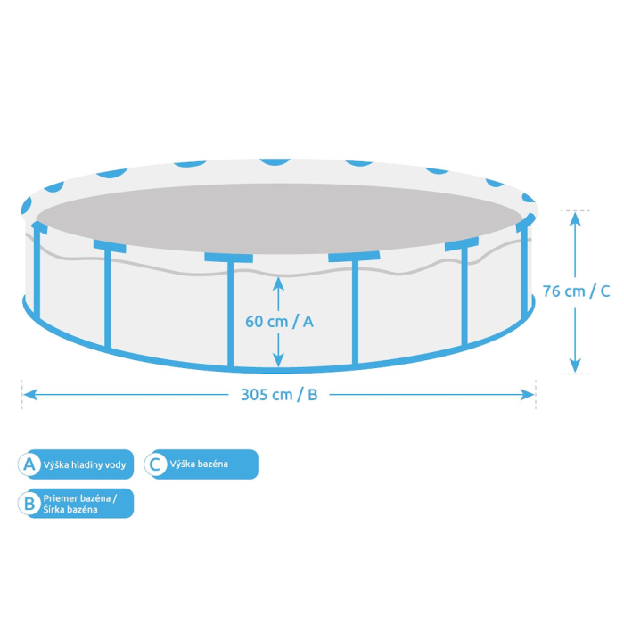 Uvedené rozmery bazéna sú iba orientačné a ovplyvniť ich môže rovnosť podkladu či objem napustenej vody. Povolená výrobná tolerancia je 5%.