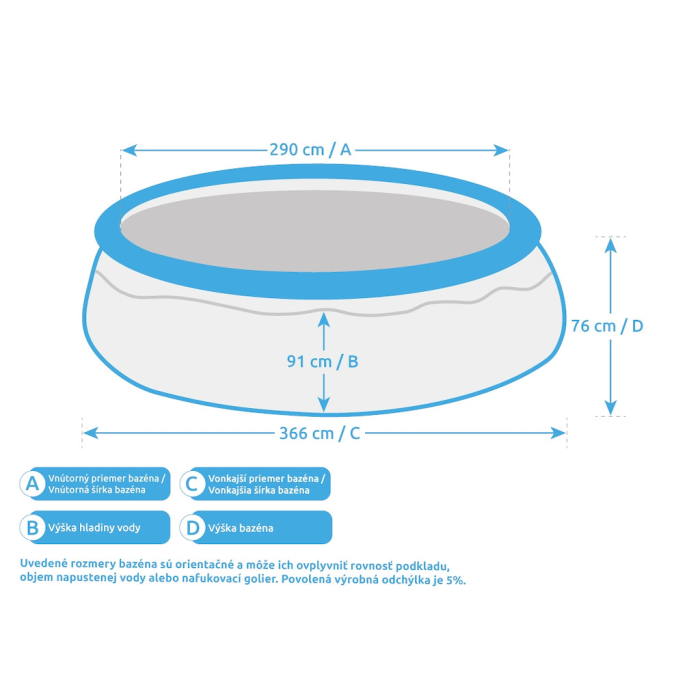 Uvedené rozmery bazéna sú len orientačné a ovplyvniť ich môže rovnosť podkladu, objem napustenej vody alebo nafúknutý golier. Povolená výrobná odchýlka je 5 %.