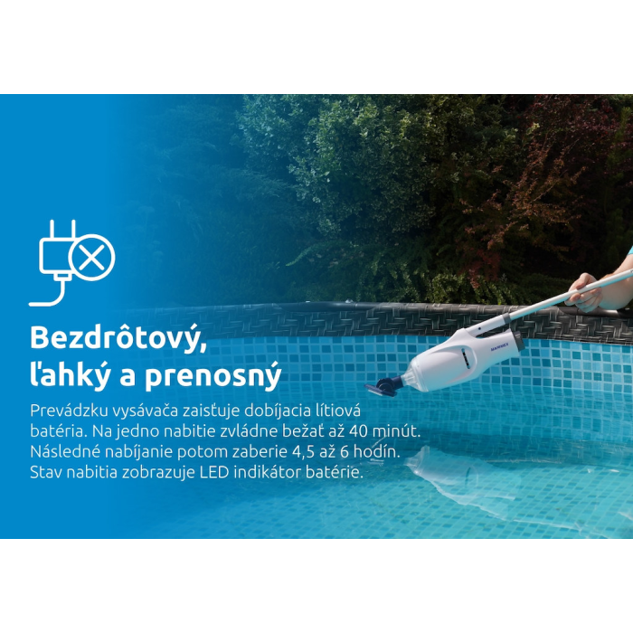Vysávač Marimex StarVac Columbia prináša vysokú flexibilitu a pohodlie pri čistení bazéna. Prevádzku vysávača zabezpečuje dobíjateľná lítiová batéria, ktorá vyniká dlhou životnosťou a spoľahlivosťou. Na jedno nabitie dokáže tento výkonný vysávač fungovať až 40 minút, čo je dostatok času na dôkladné vyčistenie bazéna. Následné nabíjanie je jednoduché a efektívne, trvá približne 4,5 až 6 hodín, počas ktorých sa batéria plne dobije a vysávač je opäť pripravený na použitie. Stav nabitia zobrazuje praktický LED indikátor, ktorý informuje o zostávajúcej kapacite batérie, takže vás nikdy neprekvapí vybitý prístroj.