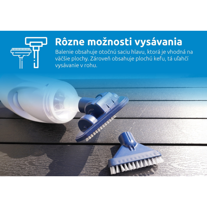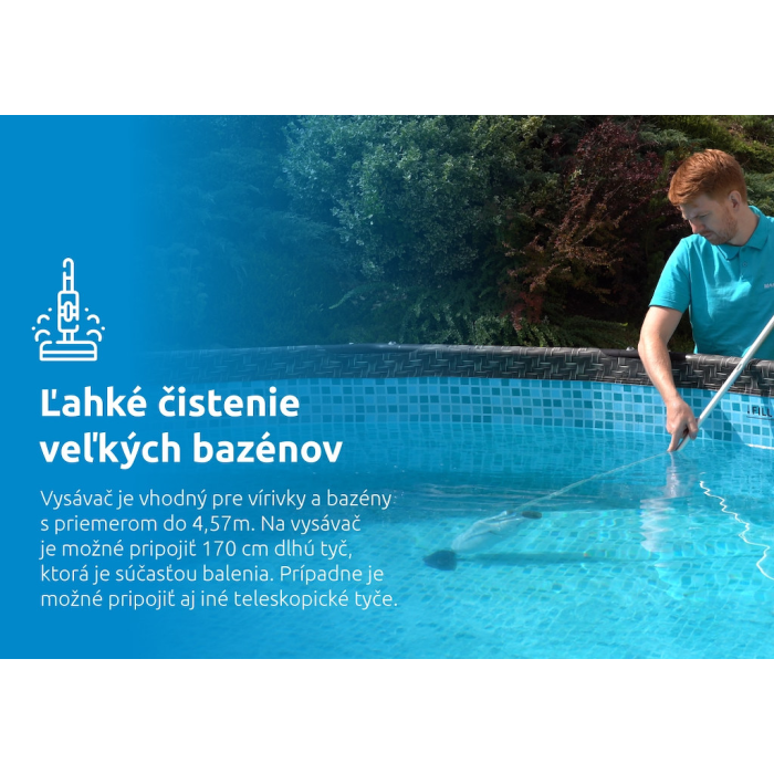 Je vhodný pre bazény s priemerom do 4,57 m. Možno ho použiť aj pre vírivky. Na vysávač je možné pripojiť 170 cm dlhú tyč, ktorá je súčasťou balenia. Prípadne je možné pripojiť aj iné teleskopické tyče. Vysávač jednoducho vyčistí dno aj steny. Vďaka tomuto vysávaču si budete počas celej kúpacej sezóny užívať krištáľovo čistú vodu so všetkým, čo k tomu patrí.