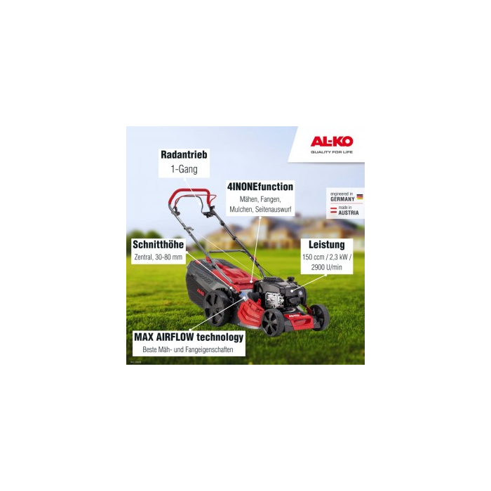 4IN1 funkcia (kosenie, zber, mulčovanie, bočné vyhadzovanie). Oceľové plechové teleso s technológiou MaxAirflow pre najlepšie vlastnosti kosenia a zberu. Veľký 70L zberný kôš s indikátorom naplnenia a zavesením EasyClick. Centrálne a pohodlné nastavenie výšky kosenia. Pohon zadných kolies - 1 stupeň. Kolesá XXL na ľahké tlačenie a dobrú trakciu. Pohodlnejšie prenášanie vďaka prednej rukoväti. Ergonomicky tvarovaná vodiaca rukoväť.