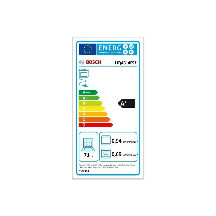 Vstavaná rúra Bosch HQA514ES3 s energetickou triedou A+ a kapacitou 71 l. Ponúka 8 funkcií, vstavaný displej a teleskopický výsuv. S rozmiermi 59,5 x 59,4 x 54,8 cm a grilovacou funkciou je ideálnym doplnkom do modernej kuchyne.