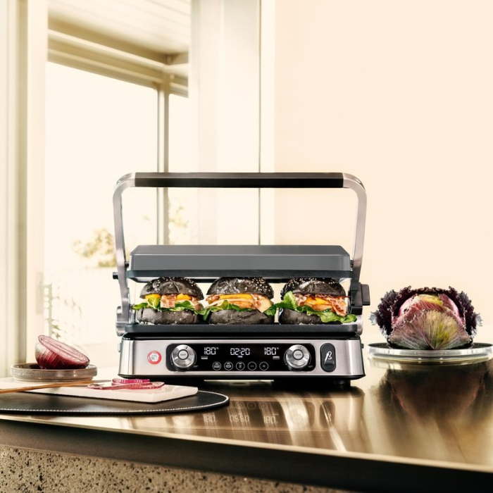 Všestranný kontaktný gril Braun Multigrill 9 Pro CG9167 s príkonom 2 200 W ponúka 3 pozície grilu v jednom a to kontaktnú, otvorenú a pozíciu rúra. Pre pohodlnejšiu prípravu jedál sú tu 2 nezávislé termostaty pre nastavenie teploty oboch dosiek a zabudované výhrevné telesá pre rýchle nahriatie. Maximálna teplota je 265°C. Grilovacia plocha je dostatočne veľká a vstavaná odkvapkávacia tácka zabezpečí, že jedlo sa nebude kúpať v oleji a bude zdravšie. Gril má LED display a uzamykací systém pre ľahké skladovanie. Naviac má gril funkciu Sear, pre rýchle zatiahnutie mäsa a tri automatické funkcie: hamburger, panini a keep warm.