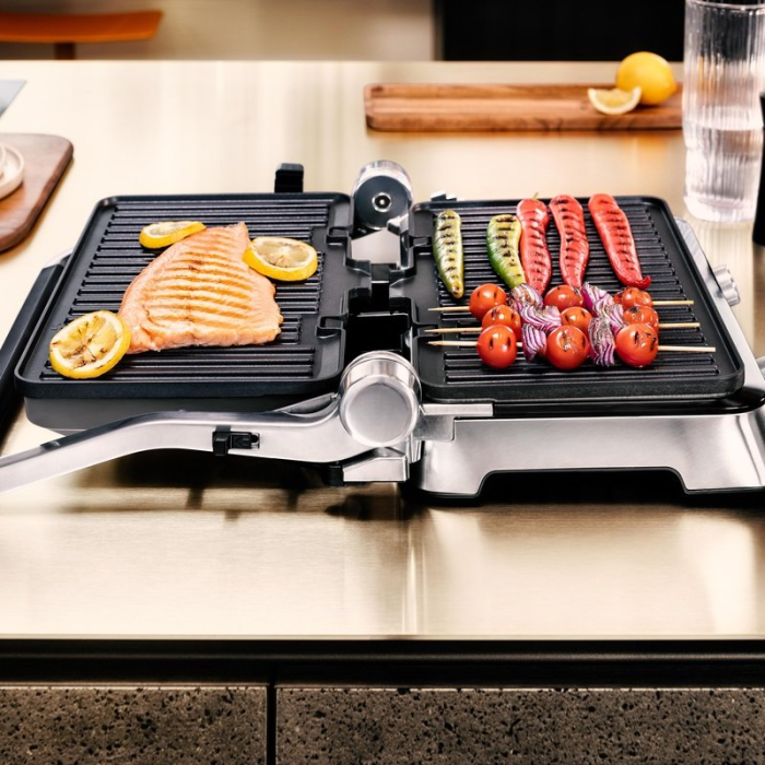 Prípravu dvoch jedál naraz vám zaistia dva nezávislé termostaty pri dvoch rôznych teplotách. Gril ponúka otvorenú pozíciu, kde môžete na jednej platničke grilovať mäso a na druhej pripravovať zeleninu, a to pri rôznych teplotách. S týmto kontaktným grilom, ktorý disponuje dvoma veľkými grilovacími plochami, pripravíte chutné jedlo na rodinnú oslavu.
