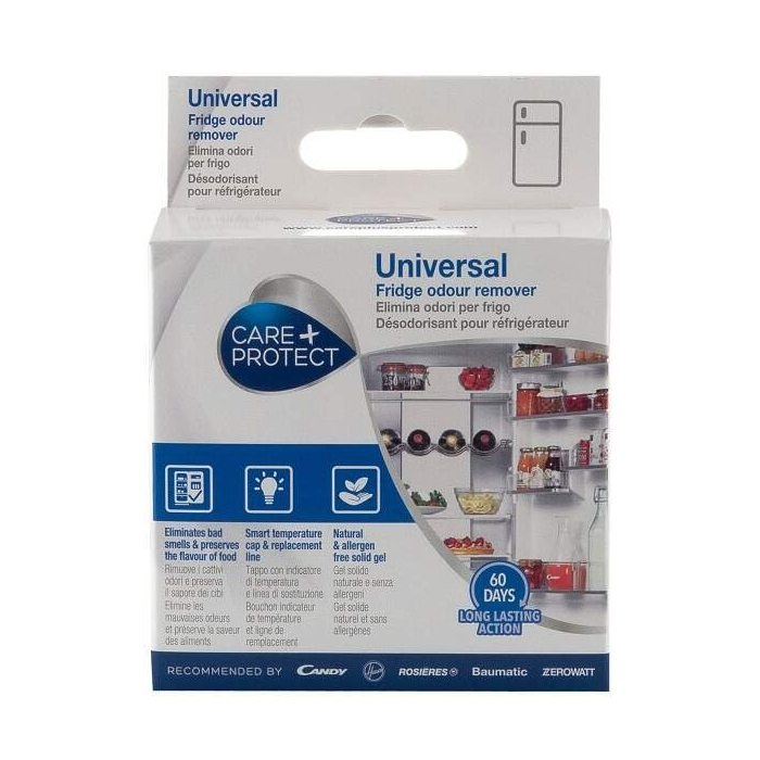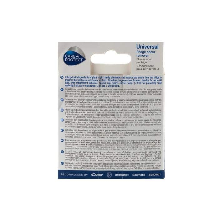 Univerzálny pohlcovač pachov Care+Protect FAD4001 odstraňuje pachy v chladničke a zachováva pôvodnú vôňu chladených potravín. Jeho podstatou je tuhý gél vyrobený zo zložiek rastlinného pôvodu. Preto neobsahuje žiadne alergény a je bez zápachu. Špeciálny uzáver ukazuje správnu teplotu pre správne skladovanie potravín (<5°C). Ak je farba na viečku tmavá, teplota v chladničke je správna, ak je svetlá, teplota v chladničke nie je pre potraviny vhodná. Účinnosť: až 60 dní.