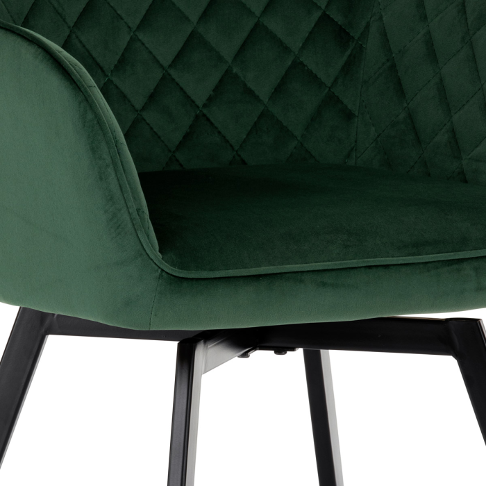 Díky svému dokonalému designu je tato židle v industriálním stylu nezaměnitelná a zároveň velmi pohodlná. Skořepina sedáku a opěradla má potah z kvalitní látky v smaragdově zeleném matném sametu. Polstrování je z PU pěny. Velmi dekorativním prvkem je výrazné kosočtvercové prošití vnitřních ploch v barvě potahu a paspule po obvodu celé skořepiny. Vybraná látka se také velmi dobře čistí. Stabilitu židle zajišťují čtyři kónické kovové nohy obdélníkového průřezu s kvalitním práškovým nástřikem v černé matné barvě. Ukončené jsou černými plastovými kluzáky, zabraňující poškození tvrdých povrchů podlah. Tato provedení produkují z tohoto modelu židle skvělou volbu pro zařízení obývacích či jídelních, ale také zasedacích místností. Nosnost židle je 110 kg. Bonusem této židle je otočný a vratným mechanismus, který umožňuje otáčení o 90° doleva a o 90° doprava a zároveň vždy vrátí sedák do původní polohy. Díky němu žiidle zůstanou vždy srovnané u stolu.