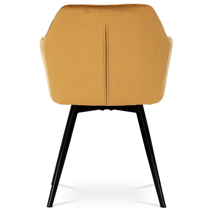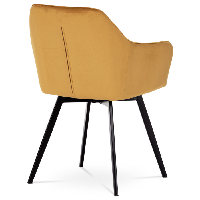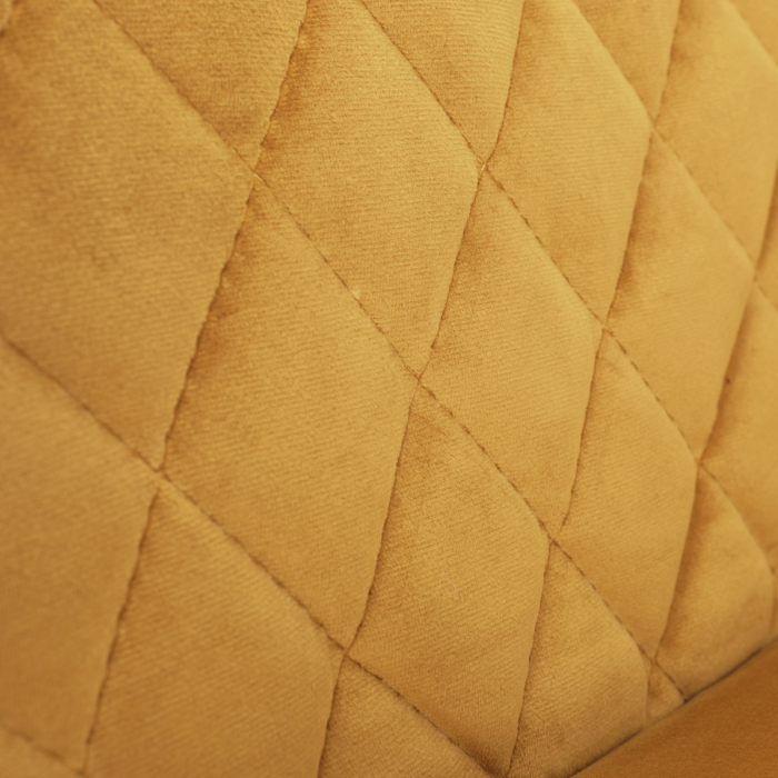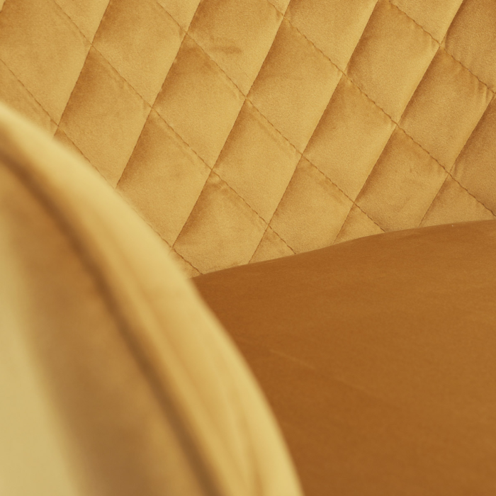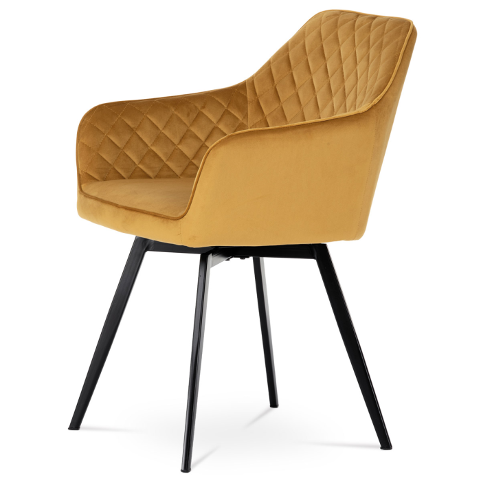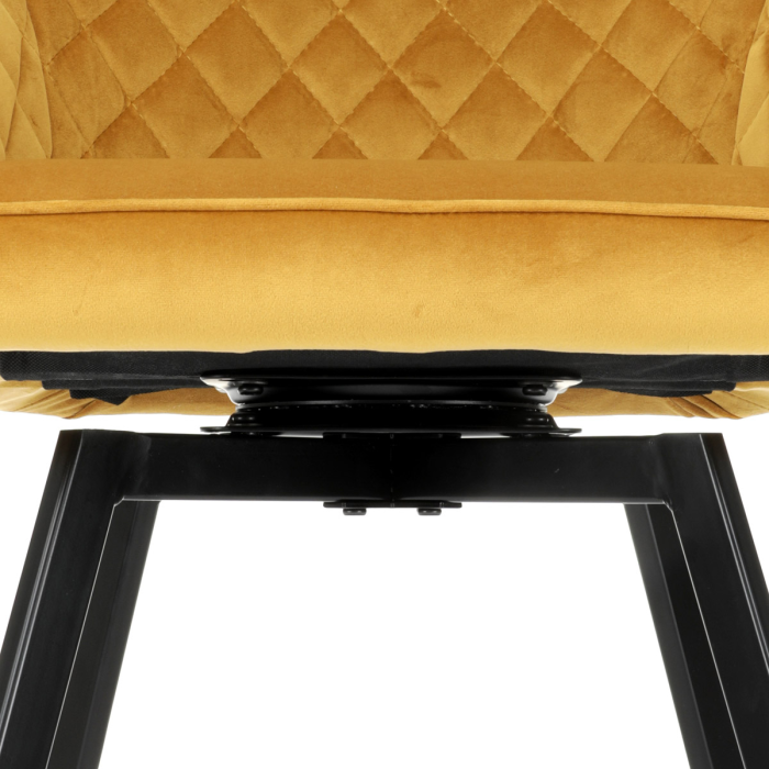 Díky svému dokonalému designu je tato židle v industriálním stylu nezaměnitelná a zároveň velmi pohodlná. Skořepina sedáku a opěráku má potah z kvalitní látky v trendy hořčicově žlutém matném sametu. Polstrování je z PU pěny. Velmi dekorativním prvkem je výrazné kosočtvercové prošití vnitřních ploch v barvě potahu a paspule po obvodu celé skořepiny. Vybraná látka se také velmi dobře čistí. Stabilitu židle zajišťují čtyři kónické kovové nohy obdélníkového průřezu s kvalitním práškovým nástřikem v černé matné barvě. Ukončené jsou černými plastovými kluzáky, zabraňující poškození tvrdých povrchů podlah. Tato provedení produkují z tohoto modelu židle skvělou volbu pro zařízení obývacích či jídelních, ale také zasedacích místností. Nosnost židle je 110 kg. Bonusem této židle je otočný a vratným mechanismus, který umožňuje otáčení o 90° doleva a o 90° doprava a zároveň vždy vrátí sedák do původní polohy. Díky němu žiidle zůstanou vždy srovnané u stolu.