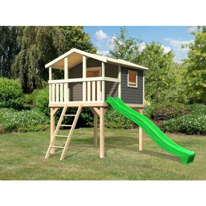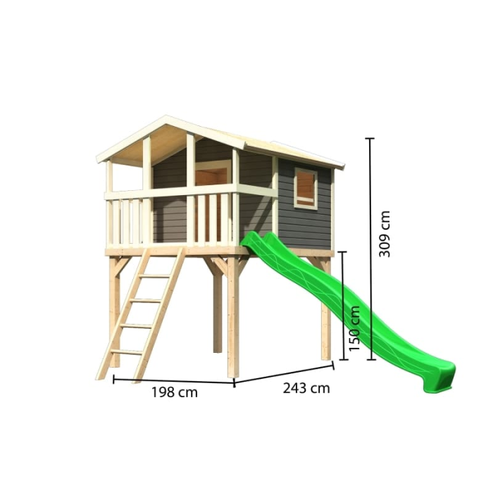 Detské ihrisko, vonkajšie rozmery š 198 x d 244 x v 309 cm, tmavo sivá farba + zelená šmykačka 300 cm.