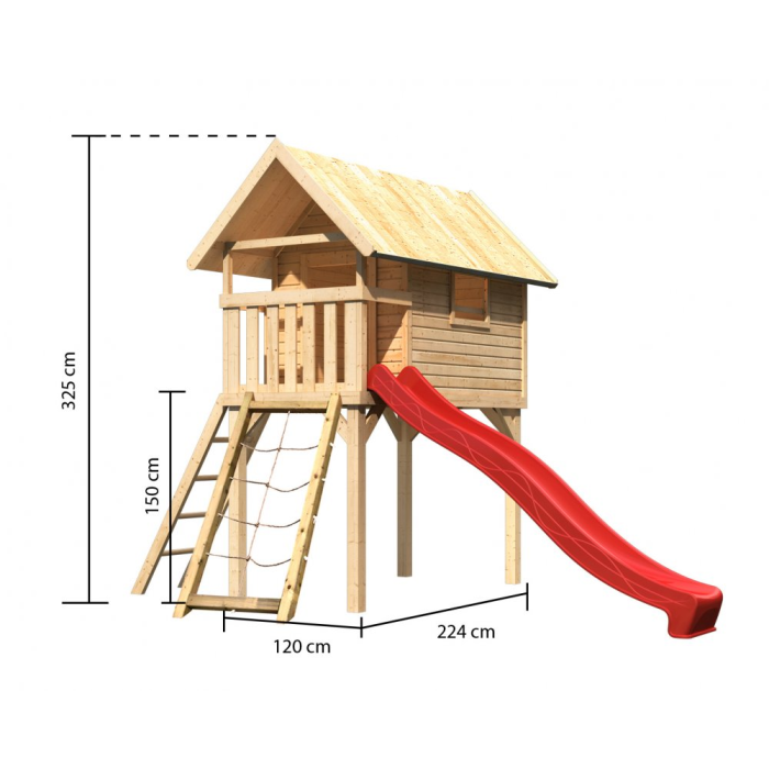 Detské ihrisko, vonkajšie rozmery š 120 x d 244 x v 325 cm + červená šmýkačka 300 cm + povrazová sieť.