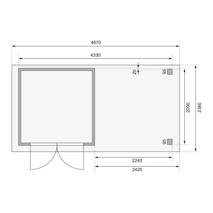 Táto verzia domčeka obsahuje prístavok vrátane zadnej steny dĺžky 240 cm montovateľný sprava alebo zľava.