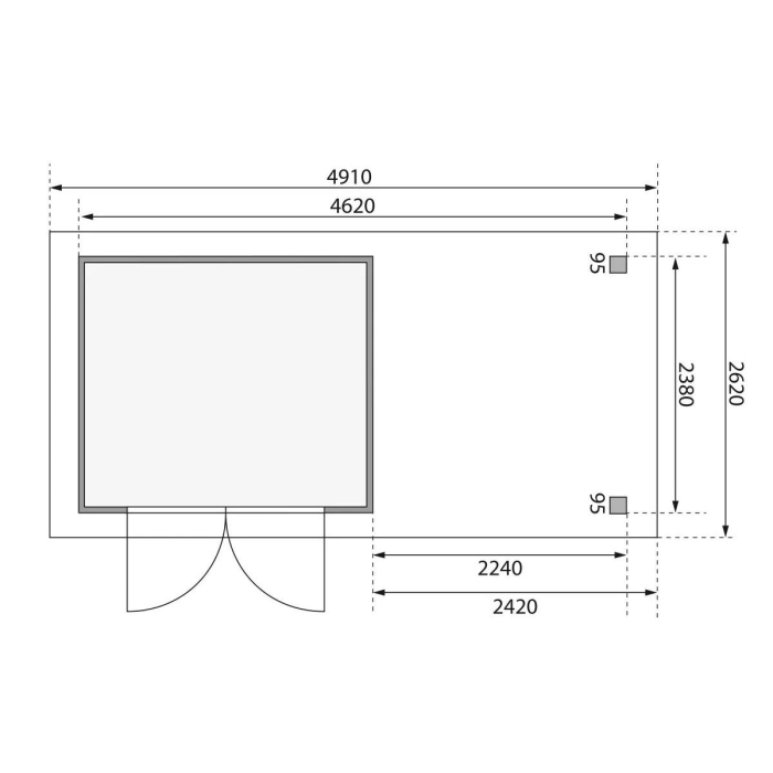 Táto verzia domčeka obsahuje prístavok vrátane zadnej steny dĺžky 240 cm montovateľný sprava alebo zľava.