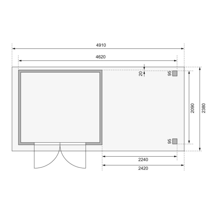 Táto verzia domčeka obsahuje prístavok vrátane zadnej a bočnej steny dĺžky 240 cm montovateľný sprava alebo zľava.