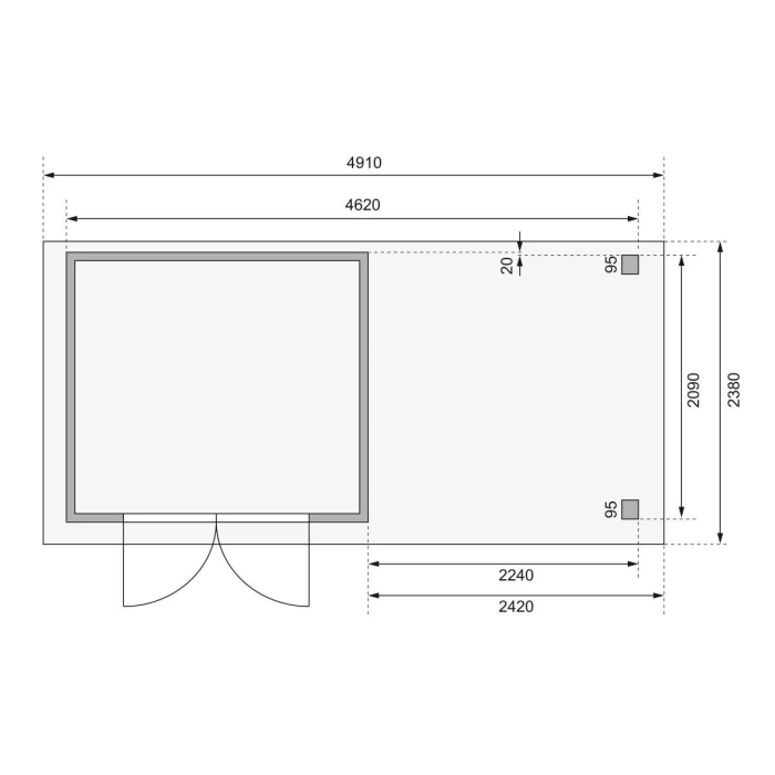 Táto verzia domčeka obsahuje prístavok vrátane zadnej a bočnej steny dĺžky 240 cm montovateľný sprava alebo zľava.