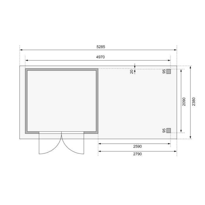 Táto verzia domčeka obsahuje prístavok vrátane zadnej steny dĺžky 280 cm montovateľný sprava alebo zľava.