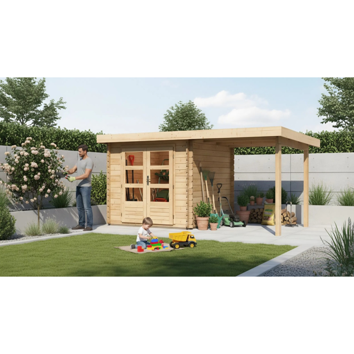 Základný model dreveného domčeka pre vašu záhradu. Tento model má pultovú strechu a dvojkrídlové dvere na pántoch s oknom v každom krídle. Stavebným materiálom domčeka sú drevené profily hrúbky 28 mm perfektne vyfrézované zo severského smreka. Dodávame ako stavebnicu v rozloženom stave, veľkou výhodou tohto radu je patentovaný rohový spoj 6-Plus. Spoločne tak zaisťujú nielen odolnú a stabilnú konštrukciu ale aj robustný celkový vzhľad. Strechu tvorí celistvá doska. To garantuje extrémne jednoduchú montáž, ktorú zvládne každý domáci majster.