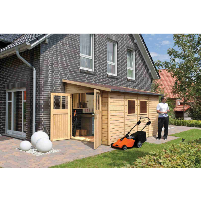 Drevený domček k stene. V domčeku môžete uskladniť záhradnú techniku, náradie alebo si v ňom vybudovať kutilskú dielňu. Domček má šikmú strechu a jedny dvojkrídlové dvere na pántoch s oknom v každom krídle. Stavebným materiálom domčeka sú drevené profily hrúbky 19 mm perfektne vyfrézované zo severského smreka. Dodávame ako stavebnicu v rozloženom stave, kde steny tvoria jednotlivé drevené profily, ktoré iba zosadíte k sebe a zoskrutkujete, strechu tvorí celistvá doska. To garantuje extrémne jednoduchú montáž, ktorú zvládne každý domáci majster.