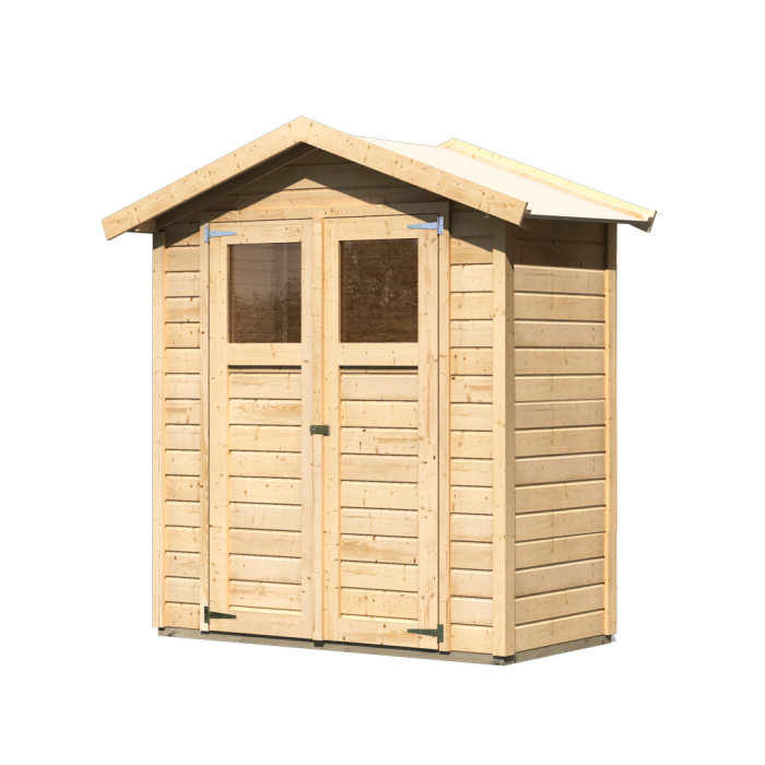 Základný model dreveného domčeka pre vašu záhradu. Tento model má sedlovú strechu a dvojkrídlové dvere na pántoch s oknom v každom krídle. Stavebným materiálom domčeka sú drevené profily hrúbky 14 mm perfektne vyfrézované zo severského smreka. Dodávame ako stavebnicu v rozloženom stave, kde steny tvoria predpripravené menšie panely, ktoré iba zoskrutkujete k sebe a strechu tvorí celistvá doska. To garantuje extrémne jednoduchú montáž, ktorú zvládne každý domáci majster.