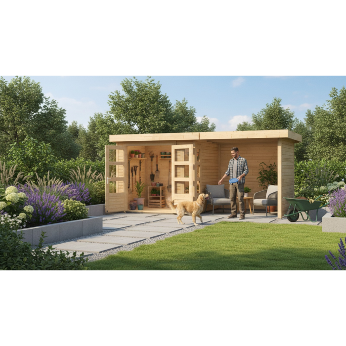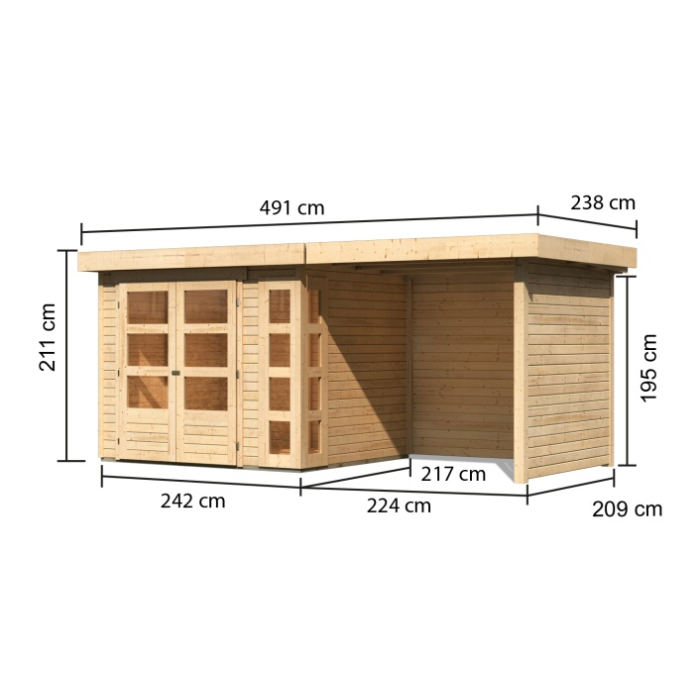 Táto verzia domčeka obsahuje aj prístavok vrátane zadnej a bočnej steny dĺžky 240 cm.