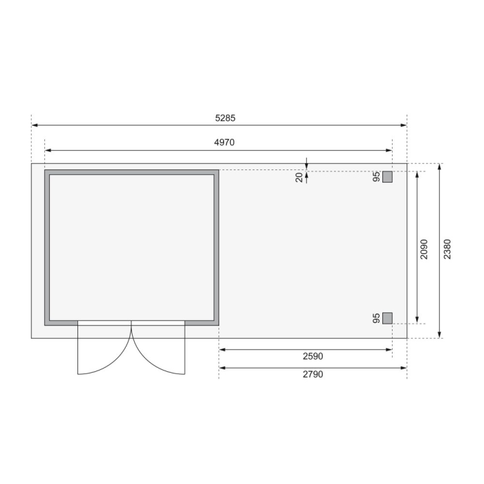 Táto verzia domčeka obsahuje aj prístavok vrátane zadnej a bočnej steny dĺžky 280 cm.
