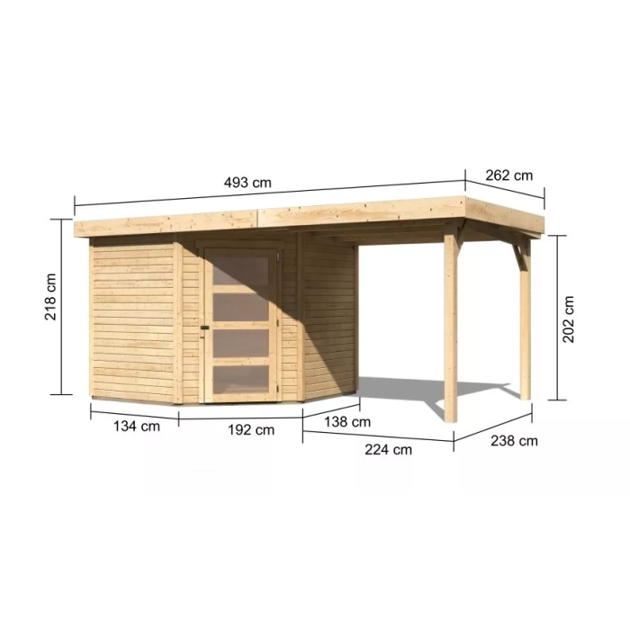 Táto verzia domčeka obsahuje aj otvorenú prístavbu dĺžky 240 cm montovateľnou sprava alebo zľava.