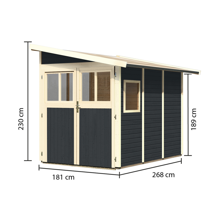 Drevený domček k stene, hrúbka steny 19 mm, rozmery š 181 x d 268 cm, vonkajšia plocha domčeka 4,85 m2.