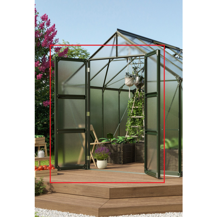 Pri skleníkoch VITAVIA SIRIUS a VITAVIA URANUS ponúkame možnosť vymeniť existujúce posuvné dvere za dvere na pántoch. Dverami na pántoch je možné nahradiť pôvodné posuvné dvere (tie je nutné demontovať). Rám dverí je vyrobený z eloxovaného hliníka v zelené farbe, ktorý zaisťuje vysokú odolnosť a ochranu pred prírodnými vplyvmi pre dlhodobé využitie.