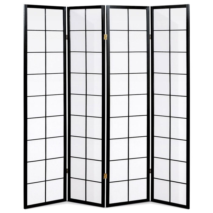 4dílný volně stojící paraván s konstrukcí z masivního smrkového dřeva v černé barvě a výplní z bílé netkané textilie. Plní nejen funkci okrasnou, ale také praktickou. Lze jej použít jako zástěnu nebo diskrétní i optickou dělící příčku nejen v bytě, ale i v komerčních prostorách. Díky skládací konstrukci a celkové nízké hmotnosti jej lze bez problémů přemísťovat a manipulovat s ním. Kombinace dřeva a netkané textilie působí vzdušným dojmem, stylově lze paraván umístit do jakkoli zařízeného interiéru. V každém si najde zasloužené místo. Výška paravánu je 178 cm, šíře jednoho dílu 43,5 cm, celková plná šíře je 176 cm. Tloušťka stěny jsou 2 cm. Stěny paravánu jsou k sobě připevněny kovovými pomosazenými panty. Celková hmotnost je 6,5 kg.