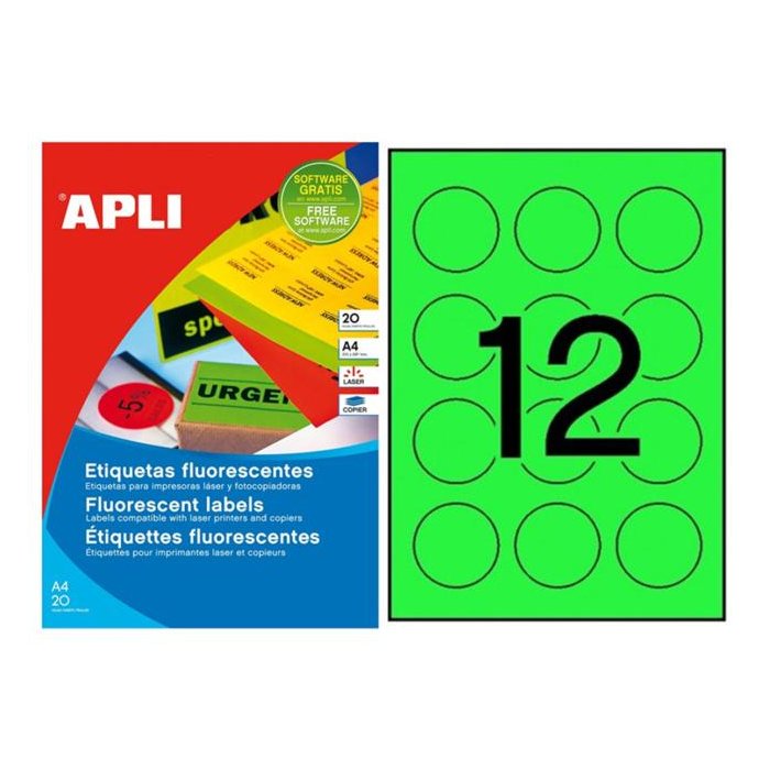 Etikety kruhové farebné priemer 60 mm APLI A4 20 hárkov fluo zelené