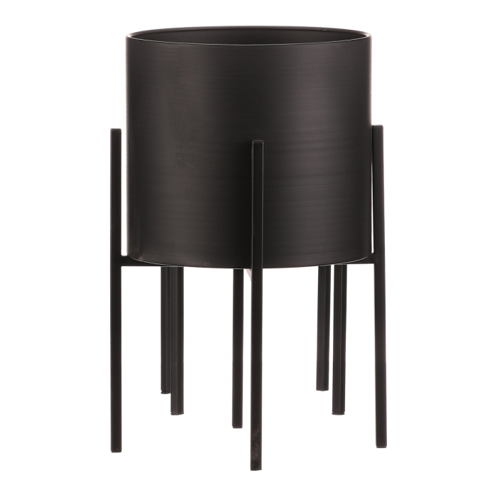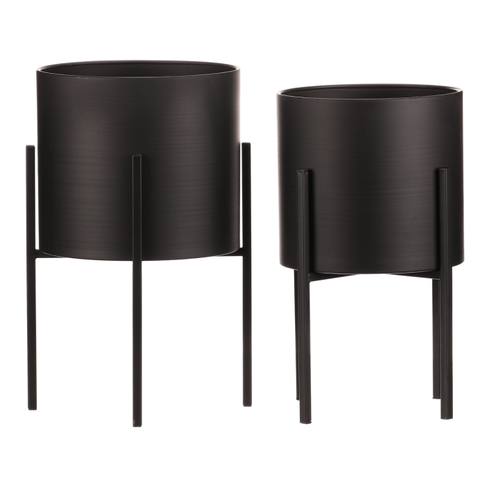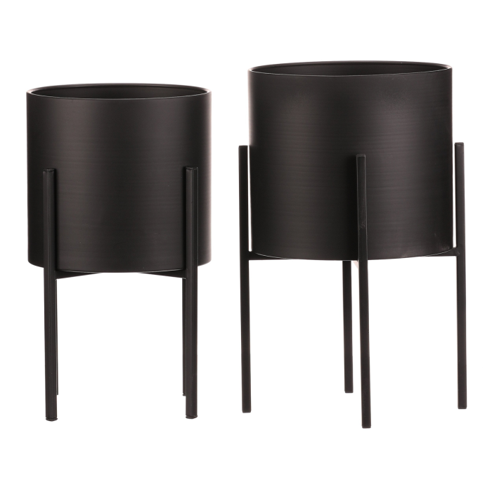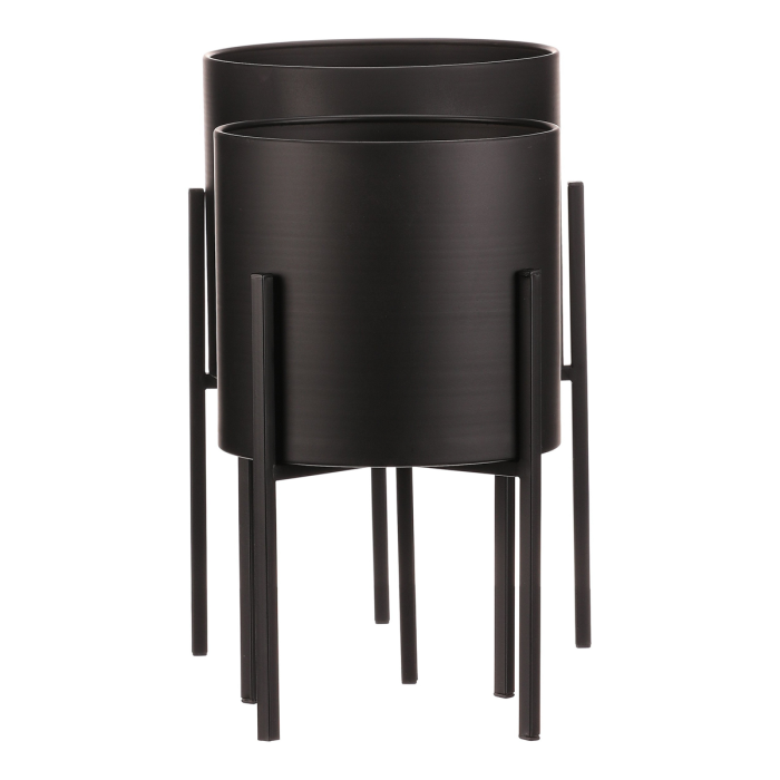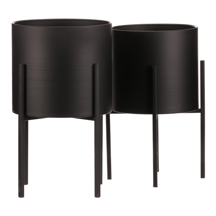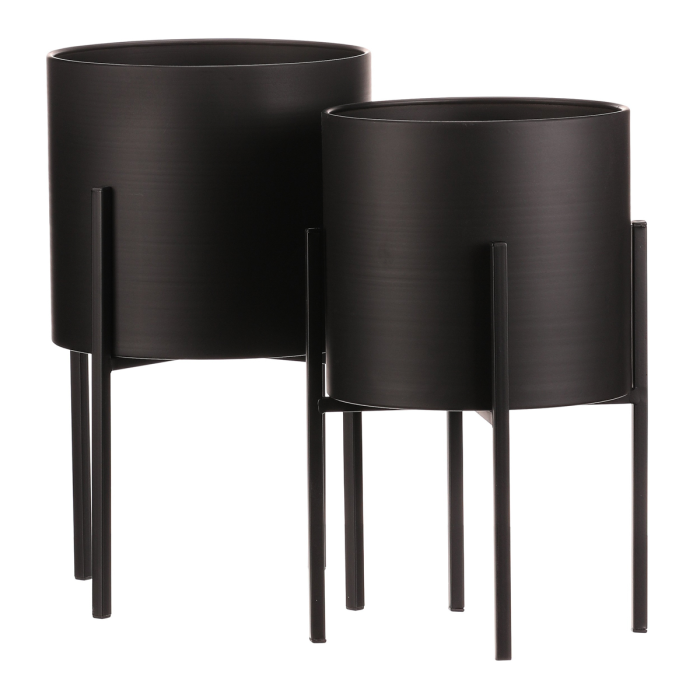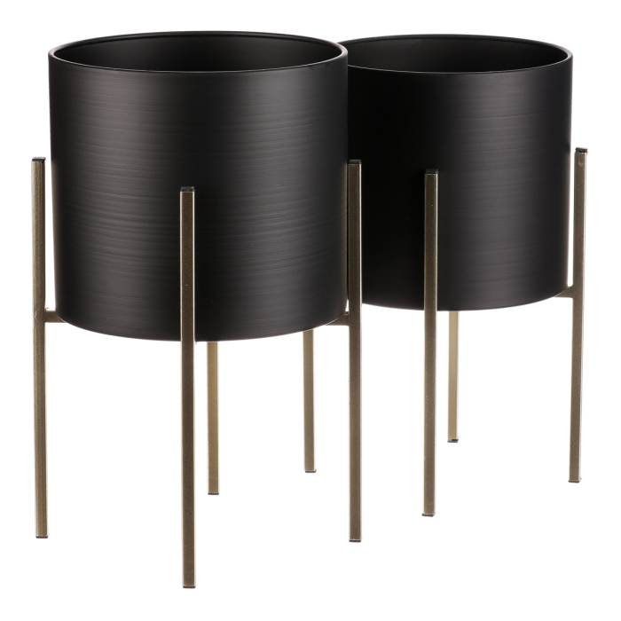 Set 2 ks kovových stojanů na květiny. interiérové provedení. Konstrukce a obal na květináč je kovový. Obal je v černém matu a nohy ve zlaté matné barvě. Minimalistický design, industriální styl. Doporučujeme do obalu stojanu vkládat květinu již v květináči. Obal nemá odtokové otvory. Stojany jsou dodávány vcelku, není potřeba montáž.