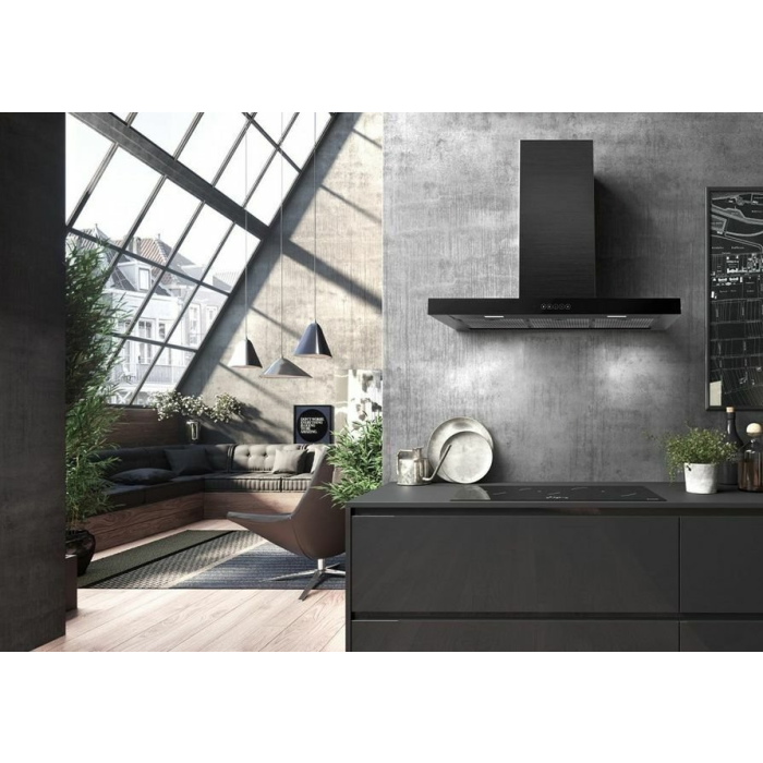 Odsávač pár s klasickým tvarom obráteného písmena T sa môže pýšiť dotykovým ovládaním nevystupujúcim z línie čelného panelu. Prevedenie čierny/čierne sklo
