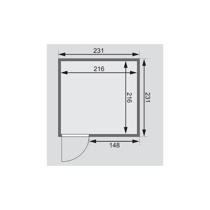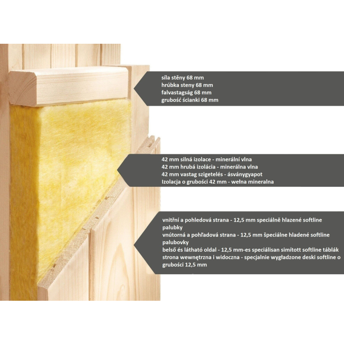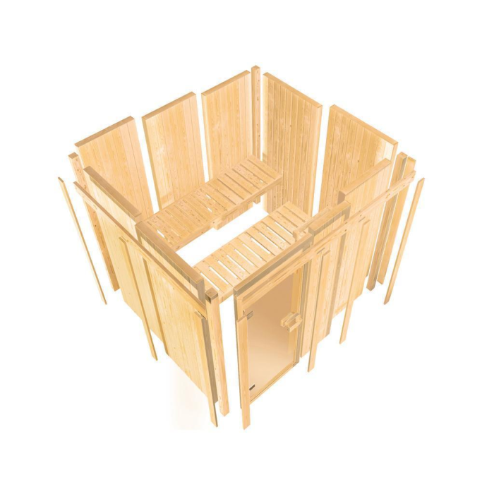 Fínska sauna určená pre tri ležiace osoby. Má rozmery š 231 x h 231 x v 198 cm. Tento model fínskej sauny je určený do temperovaných interiérov domu alebo bytu. Jej výrobca, firma KARIBU HOLZTECHNIK z nemeckých Brém, dokázala svojimi výrobkami úspešne nadviazať na stáročnú tradíciu škandinávskeho saunovania a súčasne do nej zapracovať dnešné moderné technológie. Sauna je celá vyrobená z dreva severského smreka v prírodnom prevedení. Drevo pochádza zo vzdialeného severu Európy a je chemicky úplne neošetrené (nie je ani namorené ani nalakované). V dôsledku toho je prosté všetkých známych problematických látok, ktoré by sa v priebehu saunovania mohli z dreva uvoľňovať. Táto interiérová sauna vykazuje mimoriadne tepelno-izolačné vlastnosti. Steny sauny sú zložené z vnútornej a vonkajšej vrstvy špeciálne hladených dosiek s perom a drážkou, medzi ktorými je 42 mm hrubá tepelná izolácia v podobe minerálnej vlny. Celková hrúbka steny je tak 68 mm. Zadné alebo bočné nepohľadové strany orientované k stene miestnosti majú vonkajšiu stranu zo sololitu. Preto sú pri rovnakej tepelnej izolácii o cca 10 mm tenšie ako pohľadové strany pokryté palubovkami.