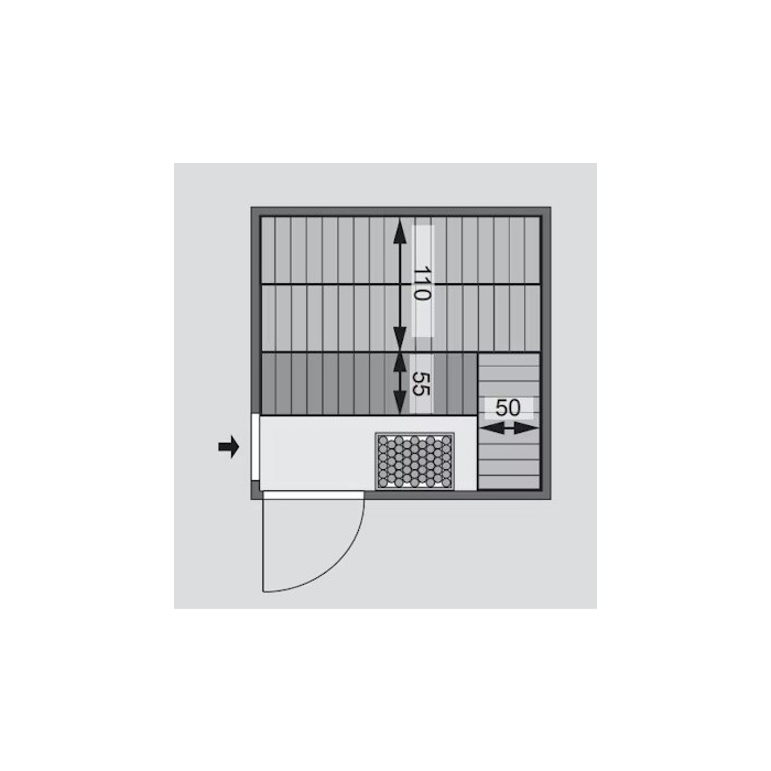 Sauna nemá vlastnú podlahu a je nutné ju umiestniť výhradne v miestnosti so zodpovedajúcou podlahovou krytinou, ideálne dlažbou. Saunu dodávame vo verzii bez stropnej rímsy (profilu) pri strope, v ktorom môže byť inštalované dodatočné LED osvetlenie.