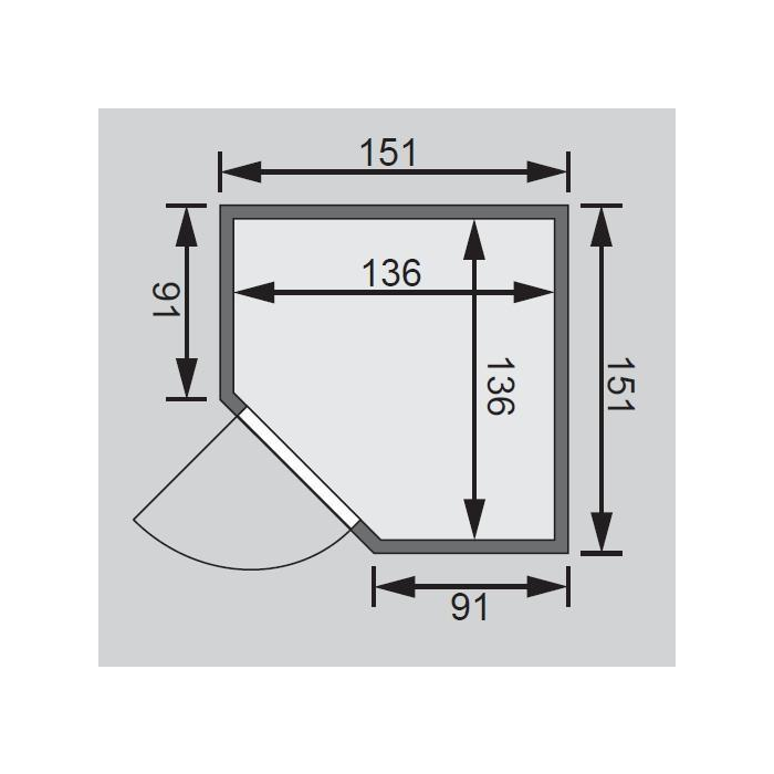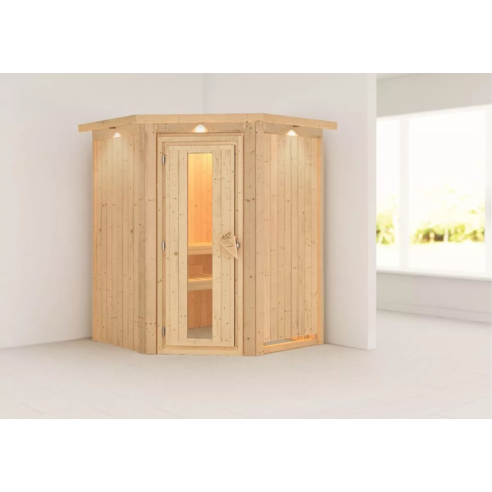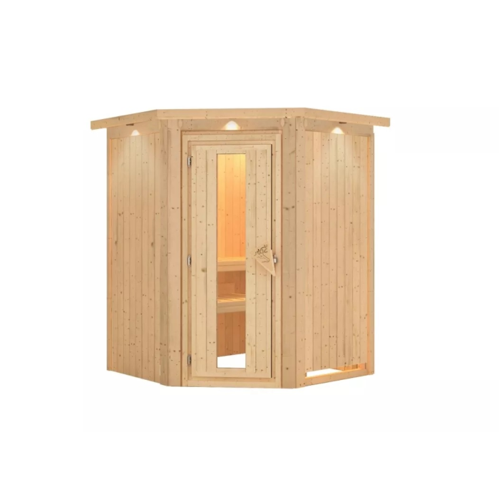 Malá fínska sauna určená až pre dve osoby. Má rozmer š 151 x h 151 x v 198 cm s rohovými dverami. Tento model fínskej sauny je určený do temperovaných interiérov domu alebo bytu. Jej výrobca, firma KARIBU HOLZTECHNIK z nemeckých Brém, dokázala svojimi výrobkami úspešne nadviazať na stáročnú tradíciu škandinávskeho saunovania a súčasne do nej zapracovať dnešné moderné technológie. Sauna je celá vyrobená z dreva severského smreka v prírodnom prevedení. Drevo pochádza zo vzdialeného severu Európy a je chemicky úplne neošetrené (nie je ani namorené ani nalakované). V dôsledku toho je prosté všetkých známych problematických látok, ktoré by sa v priebehu saunovania mohli z dreva uvoľňovať. Táto interiérová sauna vykazuje mimoriadne tepelno-izolačné vlastnosti. Steny sauny sú zložené z vnútornej a vonkajšej vrstvy špeciálne hladených dosiek s perom a drážkou, medzi ktorými je 42 mm hrubá tepelná izolácia v podobe minerálnej vlny. Celková hrúbka steny je tak 68 mm. Zadné alebo bočné nepohľadové strany orientované k stene miestnosti majú vonkajšiu stranu zo sololitu. Preto sú pri rovnakej tepelnej izolácii o cca 10 mm tenšie ako pohľadové strany pokryté palubovkami.