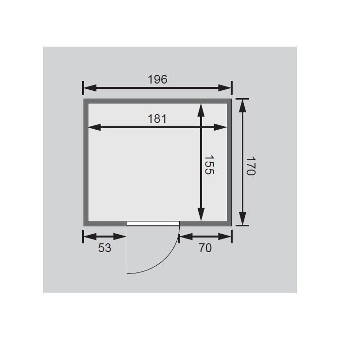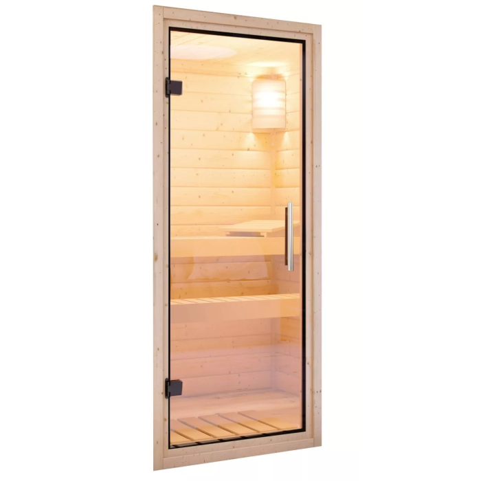 Fínska sauna určená pre dve ležiace osoby. Má obdĺžnikový tvar š 196 x h 170 x v 198 cm. Tento model fínskej sauny je určený do temperovaných interiérov domu alebo bytu. Jej výrobca, firma KARIBU HOLZTECHNIK z nemeckých Brém, dokázala svojimi výrobkami úspešne nadviazať na stáročnú tradíciu škandinávskeho saunovania a súčasne do nej zapracovať dnešné moderné technológie. Sauna je celá vyrobená z dreva severského smreka v prírodnom prevedení. Drevo pochádza zo vzdialeného severu Európy a je chemicky úplne neošetrené (nie je ani namorené ani nalakované). V dôsledku toho je prosté všetkých známych problematických látok, ktoré by sa v priebehu saunovania mohli z dreva uvoľňovať. Táto interiérová sauna vykazuje mimoriadne tepelno-izolačné vlastnosti. Steny sauny sú zložené z vnútornej a vonkajšej vrstvy špeciálne hladených dosiek s perom a drážkou, medzi ktorými je 42 mm hrubá tepelná izolácia v podobe minerálnej vlny. Celková hrúbka steny je tak 68 mm. Zadné alebo bočné nepohľadové strany orientované k stene miestnosti majú vonkajšiu stranu zo sololitu. Preto sú pri rovnakej tepelnej izolácii o cca 10 mm tenšie ako pohľadové strany pokryté palubovkami.