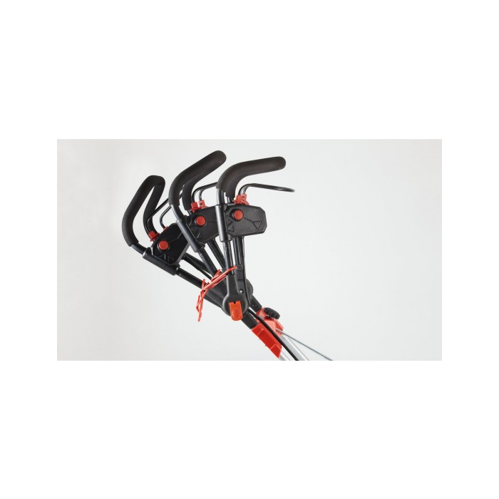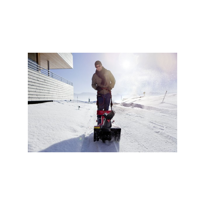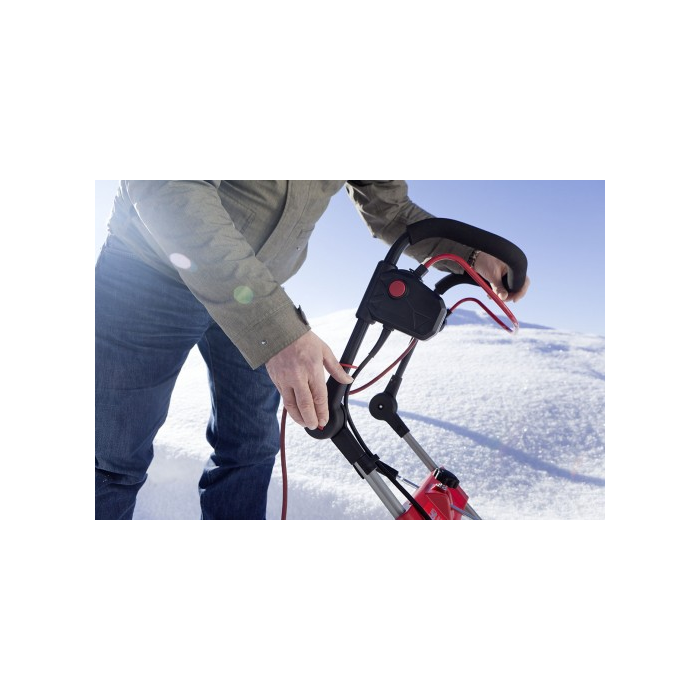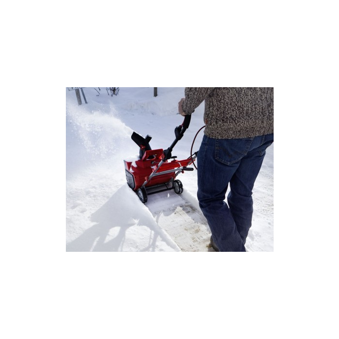 Powerful 230 V electric motor with 2,000 W output. Lightweight: only 14,5 kg; for areas up to 150 m². Working width 46 cm, intake height 30 cm. Discharge distance max. 6m; discharge adjustment: manual, 190°. Conveyor technology: paddle, 1-stage.