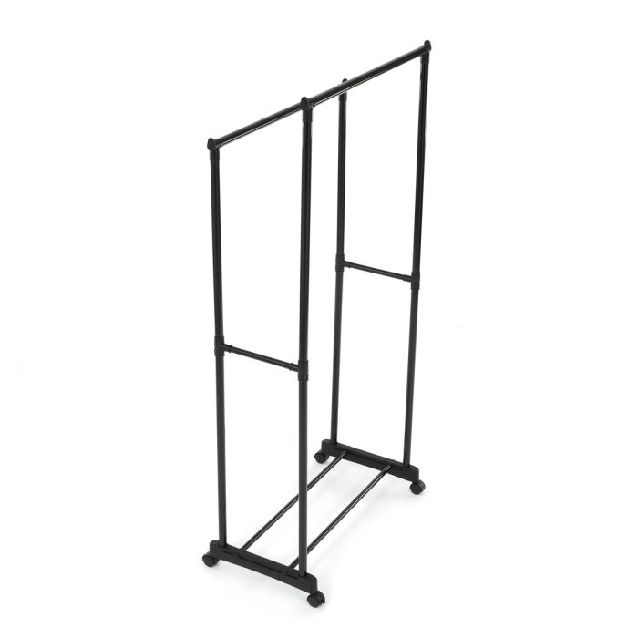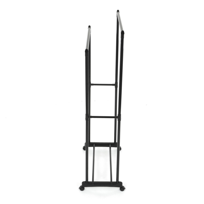 Praktický stojan na šaty značky Autronic je ideálním řešením pro přehledné uspořádání oblečení a doplňků. Černá kovová konstrukce nabízí odolnost a moderní vzhled, který snadno zapadne do jakéhokoli interiéru. Stojan disponuje dvěma tyčemi na zavěšení oděvů a dolní policí pro boty či tašky. Díky kolečkům je snadno přemístitelný a nabízí flexibilitu při jeho využití. Nastavitelná výška umožňuje přizpůsobení vašim potřebám, což z něj činí ideální doplněk do šatny, ložnice nebo předsíně.
