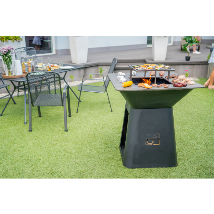 Robustný oceľový gril s planchou, špeciálna povrchová úprava pre dlhú životnosť, rozmery grilovacej plochy 85 x 85 cm, výška grilu 90,5 cm, priestor na ukladanie dreva, ľahké čistenie. V balení je aj obal na gril a príslušenstvo.