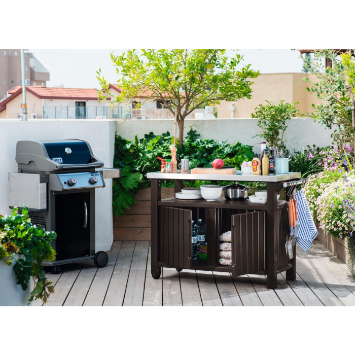 Grilovací stolík Unity XL značky Keter má kapacitu 207 litrov. Nerezová pracovná doska, praktická rukoväť s háčikmi na zavesenie utierok a kolieska pre premiestňovanie stolíka dohromady vytvárajú dokonalé prostredie pre vonkajšie grilovanie.
