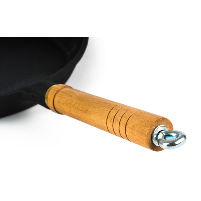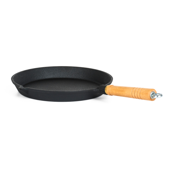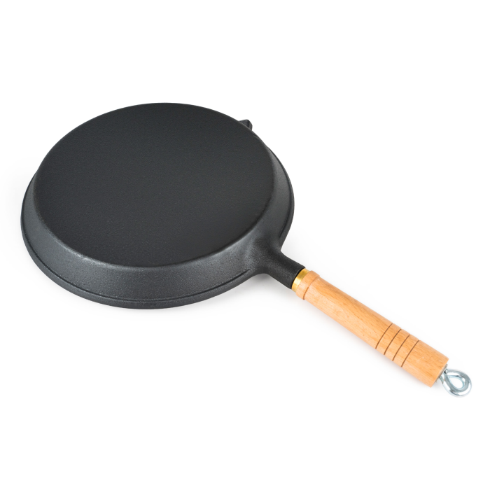 Prémiová grilovacia panvica z poctivej liatiny, priemer 25,5 cm, výška 3,2 cm, drevená rukoväť s kovovým očkom na zavesenie.